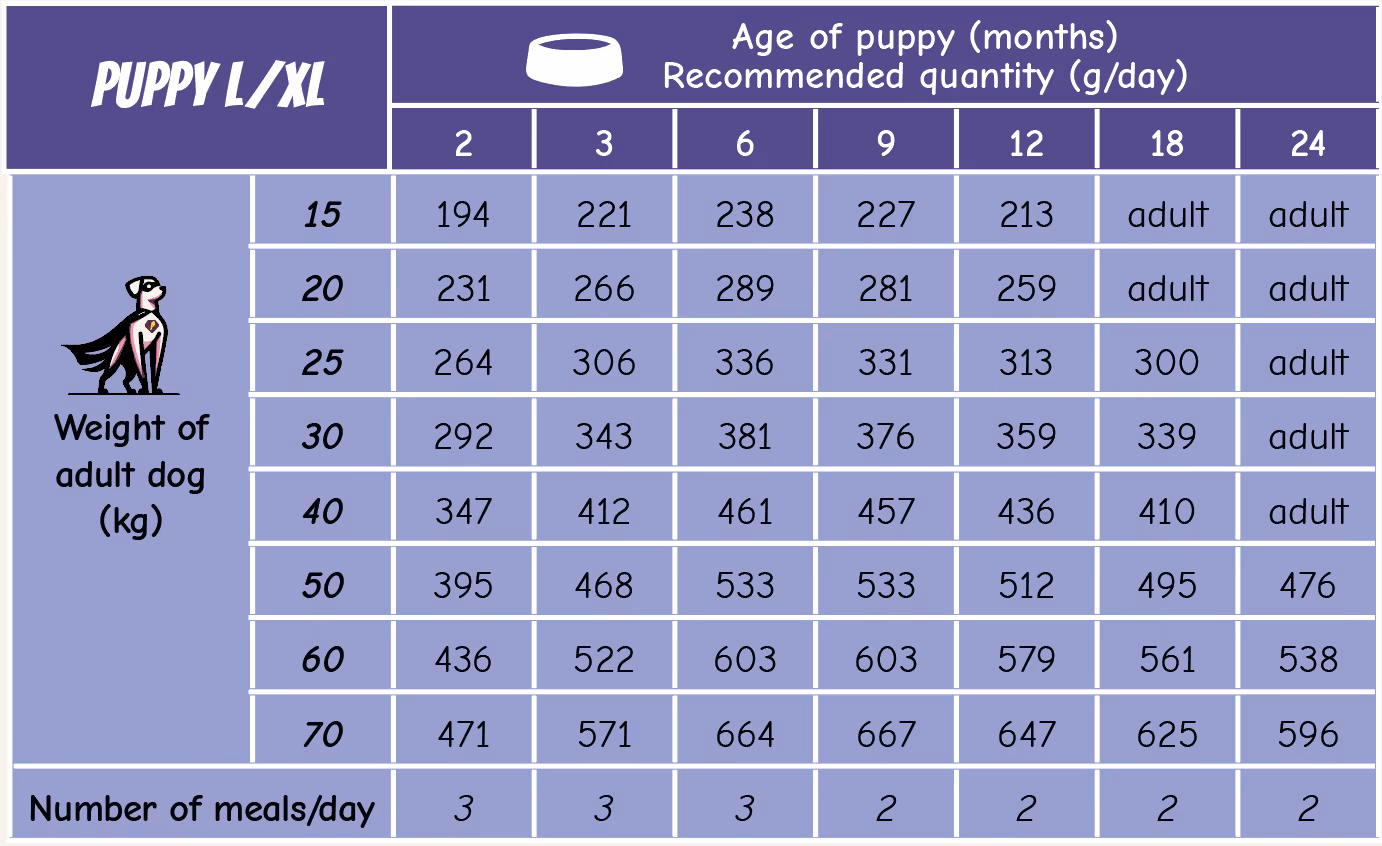 Large breeds 25-40 kg: 2-18 months / XL >40 kg: 2-24 months / Protein: 27 % / Fat: 15,5 %